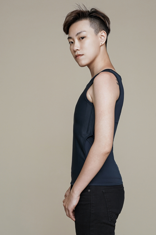 2.先將右手套入再套頭部,用左手拉著後片布右手拉著前片布,讓排扣拉扣到舒適的緊度並扣上。