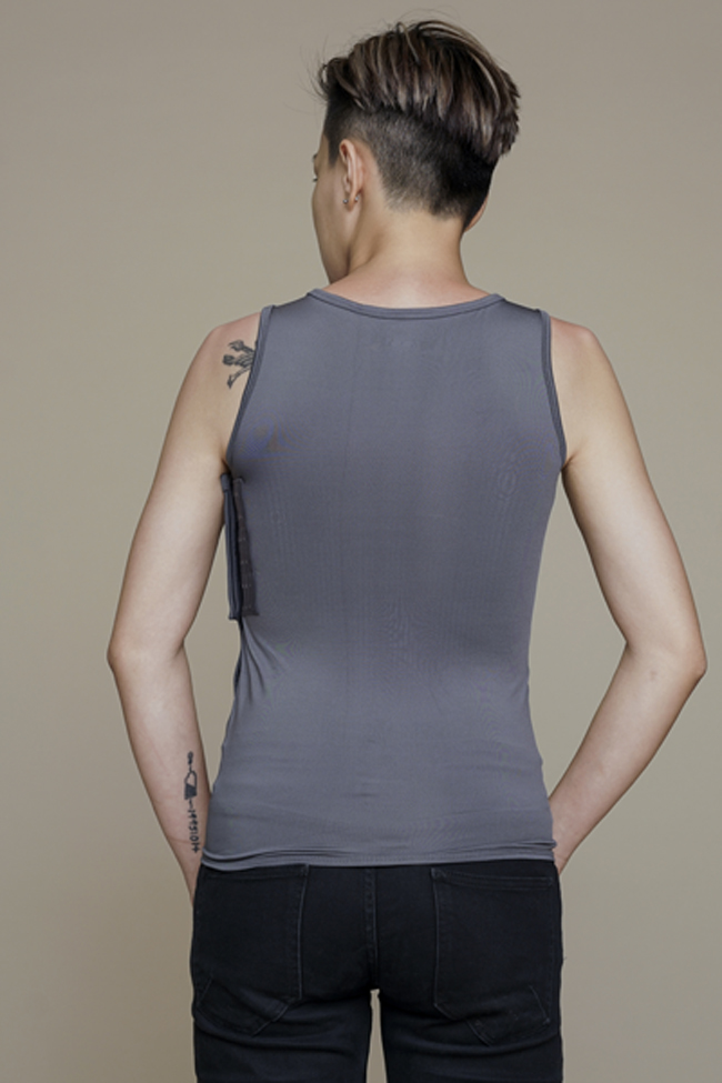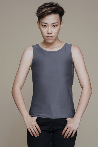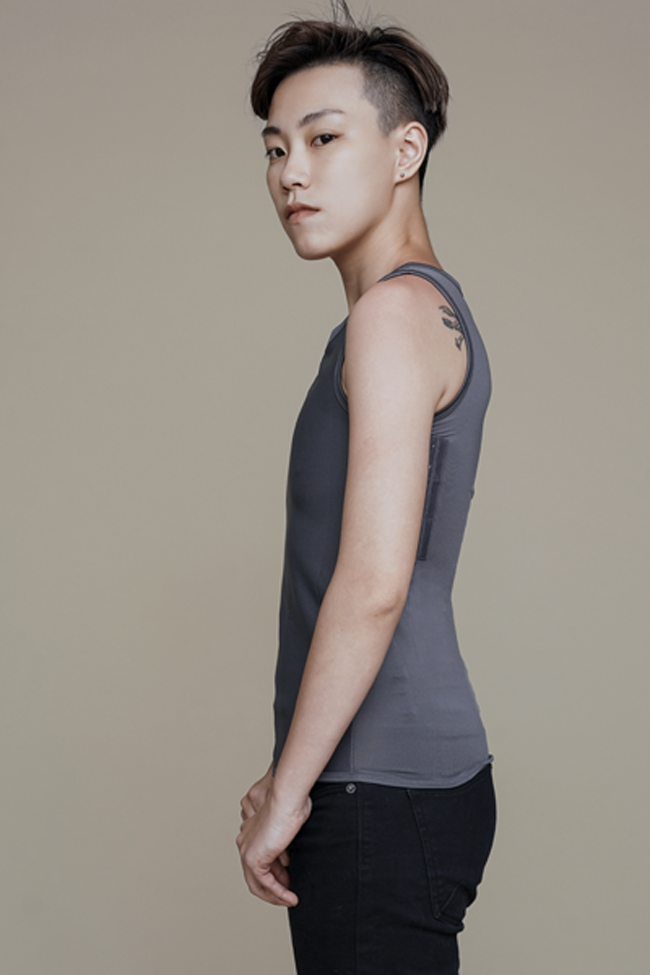 2.先將右手套入再套頭部,用左手拉著後片布右手拉著前片布,讓排扣拉扣到舒適的緊度並扣上。